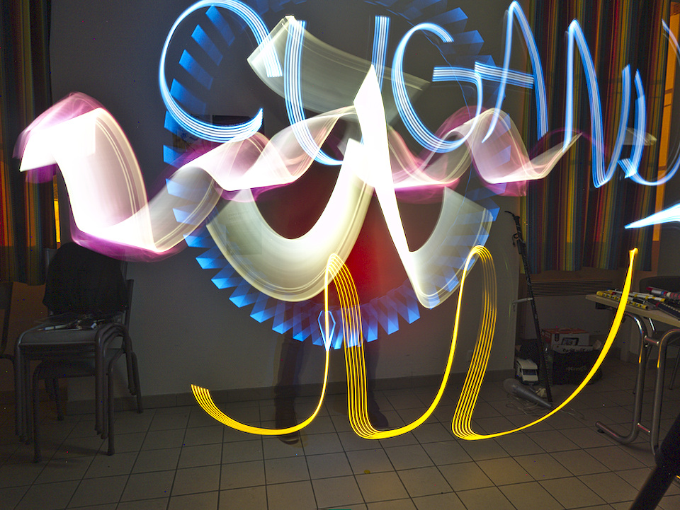 Samedi 23 Novembre, fin d’après-midi (obscurité oblige), quelques-uns d’entre nous (9 membres) sont fin prêts à accueillir Nicolas Delcourt (NDV Photographie – St Georges de Montaigu) dans les murs de notre association pour un début de soirée : « Initiation au Light Painting ». Après un petit cours sur les rudiments du Light Painting : histoire, technique de prises de vue et instruments de créations, nous passons à la pratique… A un ou deux, nous nous essayons à la composition devant « un mur » de photographes. Chaque photographe enthousiaste s’impatiente de pouvoir visualiser le résultat de l’œuvre sur son appareil… Nous en partageons quelques-unes ci-dessous pour votre plus grand plaisir.